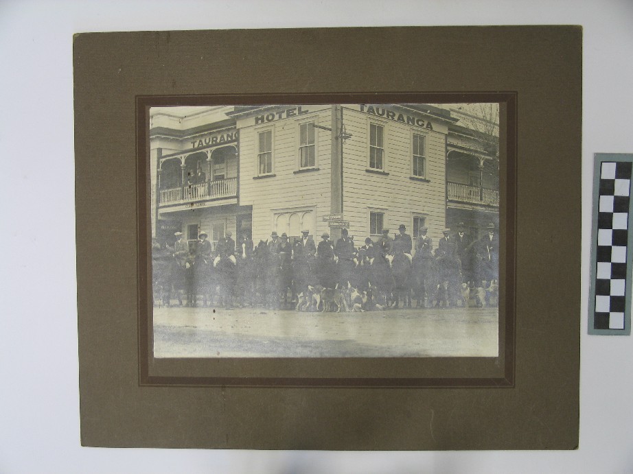 Reference Number2008.044DescriptionA photograph mounted on a brown card backing, of a group on horseback with a pack of hounds, in front of the Tauranga Hotel, on The Strand. The group are a hunting party, and only 2 of the 16 shown on horseback are wearing hard hats.Physical DescriptionDocumentary Artifact. Print, Photographic