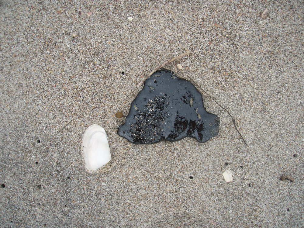 Date2011Reference NumberPhoto 21-278DescriptionOil on the beach next to a Tuatua shell.FormatDigitalPhotographer/CreatorCuming, Paul