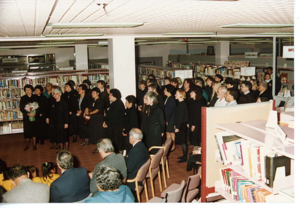 Library staff singing waiata at Tukutuku panels unveiling (1993). Pae Korokī, accessed 26/03/2026, https://paekoroki.tauranga.govt.nz/nodes/view/46862