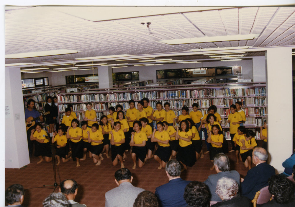 Reference NumberPhoto 21-369DescriptionSchool singing waiata at the Tauranga Library tukutuku panels unveiling as part of Women's suffrage.FormatPrint