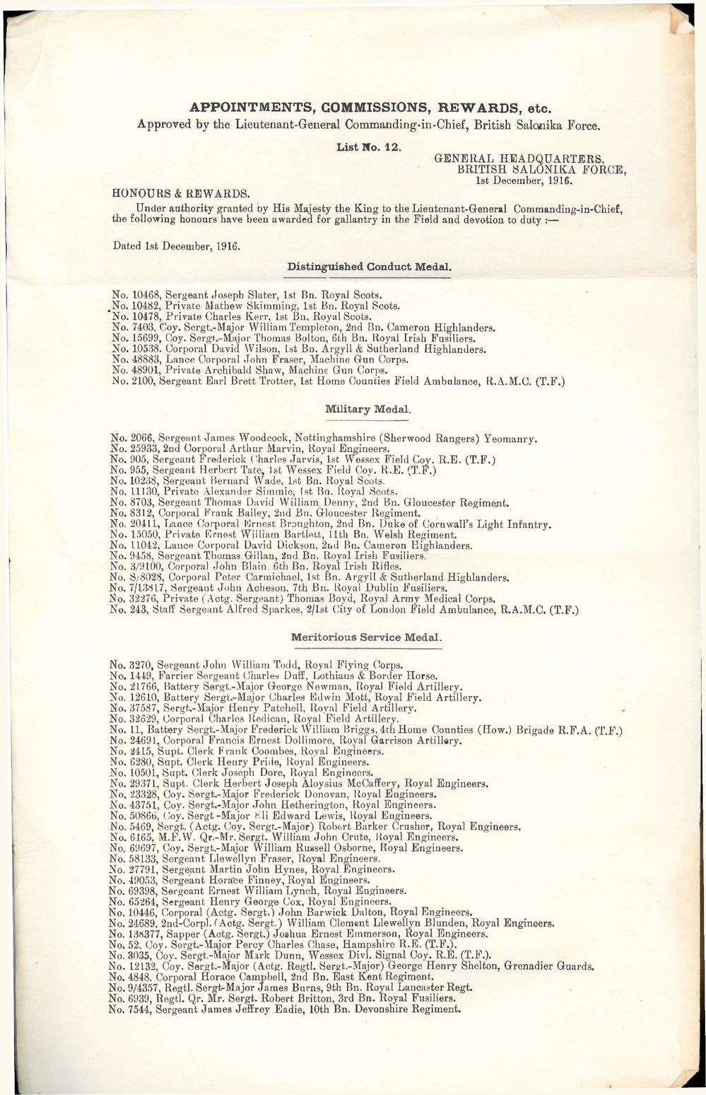 Date1939-1945Reference NumberEphemera 14-008DescriptionA document within the Goulding collection listing the appointment, commissions and rewards approved by the Lieutenant General Commanding in Chief of the British Salonika Force. The computer generated tect of the file reads (with OCR errors) "APPOINTMENTS, COMMISSIONS, REWARDS, etc.Approved by the Lieutenant-General Commanding-in-Chief, British Salonika Force.List No. 12.GENERAL HEADQUARTERS, BRITISH SALONIKA FORCE, 1st December, 1916.HONOURS & REWARDS.Under authority granted by His Majesty the King to the Lieutenant-General Commanding-in-Chief, the following honours have been awarded for gallantry in the Field and devotion to duty :—Dated 1st December, 1916.Distinguished Conduct Medal.No. 10468, Sergeant Joseph Slater, 1st Bn. Royal Scots. #No. 10482, Private Mathew Skimming, 1st Bn. Royal Scots. *No. 10478, Private Charles Kerr, 1st Bn, Royal Scots.No. 7403, Coy. Sergt.-Major William Templeton, 2nd Bn. Cameron Highlanders. No. 15699, Coy. Sergt.-Major Thomas Bolton, 6th Bn. Royal Irish Fusiliers. No. 10538. Corporal David Wilson, 1st Bn. Argyll & Sutherland Highlanders. No. 48883, Lance Corporal John Fraser, Machine Gun Corps. No. 48901, Private Archibald Shaw, Machine Gun Corps.No. 2100, Sergeant Earl Brett Trotter, 1st Home Counties Field Ambulance, R.A.M.C. (T.F.)Military Medal.No. 2066, Sergeant James Woodcock, Nottinghamshire (Sherwood Rangers) Yeomanry. No. 25933, 2nd Corporal Arthur Marvin, Royal Engineers.No. 905, Sergeant Frederick Charles Jarvis, 1st Wessex Field Coy. R.E. (T.F.) No. 955, Sergeant Herbert Tate, 1st Wessex Field Coy. R.E. (T.F.) No. 10238, Sergeant Bernard Wade, 1st Bn. Royal Scots. No. 11130, Private Alexander Simmie, 1st Bn. Royal Scots.No. 8703, Sergeant Thomas David William. Denny, 2nd Bn. Gloucester Regiment. No. 8312, Corporal Frank Bailey, 2nd Bn. Gloucester Regiment.No. 20411, Lance Corporal Ernest Broughfcon, 2nd Bn. Duke of Cornwall's Light Infantry. No. 15050, Private Ernest William Bartlett, Llth Bn. Welsh Regiment. No. IL042, Lance Corporal David Dickson, 2nd Bn. Cameron Highlanders. No. 9458, Sergeant Thomas Gillan, 2nd Bn. Royal Irish Fusiliers. No. 3/9100, Corporal John Blain. 6th Bn. Royal Irish Rifles.No. S/8028, Corporal Peter Carmichael, 1st Bn. Argyll & Sutherland Highlanders.No. 7/13817, Sergeant John Acheson, 7th Bn. Royal Dublin Fusiliers.No. 32276, Private (Actg. Sergeant) Thomas Bovd, Royal Army Medical Corps.No. 243, Staff Sergeant Alfred Sparkes, 2/lst City of London Field Ambulance, R.A.M.C. (T.F.)Meritorious Service Medal.No. 3270, Sergeant John William Todd, Royal Flying Corps.No. 1449, Farrier Sergeant Charles Duff, Lothians & Border Horse.No. 21766, Battery Sergt.-Major George Newman, Royal Field Artillery.No. 12610, Battery Sergt.-Major Charles Edwin Mott, Royal Field Artillery.No. 37587, Sergt.-Major Henry Patchell, Royal Field Artillery.No. 32629, Corporal Charles Redican, Royal Field Artillery.No. 11, Battery Sergt.-Major Frederick William Briggs, 4th Home Counties (How.) Brigade R.F.A. (T,F.) No. 24691, Corporal Francis Ernest Dollimore, Royal Garrison Artillery. No. 2415, Supt. Clerk Frank Coombes, Royal Engineers. No. 6280, Supt. Clerk Henry Pride, Royal'Engineers. No. 10501, Supt. Clerk Joseph Dore, Royal Engineers.No. 29371, Supt. Clerk Herbert Joseph Aloysius McOaffery, Royal Engineers.No, 23328, Coy. Sergt.-Major Frederick Donovan, lioyal Engineers.No. 43751, Coy. Sergt.-Major John Hetherington, Royal Engineers.No. 50866, (Joy. Sergt-Major Kli Edward Lewis, Royal Engineers.No. 5469, Sergt. (Actg. Coy. Sergt.-Major) Robert Barker Crusher, Royal Engineers.No. 6165, M.F.W. Qr.-Mr. Sergt. William John Crute, Royal Engineers.No. 69697, Coy. Sergt.-Major William Russell Osborne, Royal Engineers.No. 58133, Sergeant Llewellyn Fraser, Royal Engineers.No. 27791, Sergeant Martin John Hynes, Royal Engineers.No. 49053, Sergeant Horace Finney, Royal Engineers.No. 69398, Sergeant Ernest William Lynch, Royal Engineers.No. 65264, Sergeant Henry George Cox, Royal Engineers.No. 10446, Corporal (Actg. Sergt,) John Barwick Dalton, Royal Engineers.No. 24689, 2nd-Corpl. (Actg. Sergt.) William Clement Llewellyn Blunden, Royal Engineers.No. 138377, Sapper (Actg. Sergt.) Joshua Ernest Emmerson, Royal Engineers.No. 52, Coy. Sergt.-Major Percy Charles Chase, Hampshire R.E. (T.F.).No. 3035, Coy. Sergt.-Major Mark Dunn, Wessex Divl. Signal Coy. R.E. (T.F.).No. 12132, Coy. Sergt.-Major (Actg. Regtl. Sergt.-Major) George Henry Shelton, Grenadier Guards.No. 4848, Corporal Horace Campbell, 2nd Bn. East Kent Regiment.No. 9/4357, Regtl. Sergt-Major James Burns, 9th Bn. Royal Lancaster Regt.No. 6939, Regtl. Qr. Mr. Sergt. Robert Britton, 3rd Bn. Royal Fusiliers.No. 7544, Sergeant James Jeffrey Eadie, 10th Bn. Devonshire Regiment.List No. 12, Sheet 2.Meritorious Service Medal (continued) :—No. 6239, Regtl. Sergt.-Major George William Illing, 2nd Bn. East Yorkshire Regiment.No. 6279, Regtl. Qr.-Mr. Sergt. David Hiokmott, 1st Bn. Royal Irish Regiment.No. 1131, Coy. Sergt.-Major James Conway, 5th Bn. Royal Irish Regiment (Pioneers)No. 13158, Coy. Sergt.-Major John Parker, 12th Bn. Cheshire Regiment.No. 7/15688, Lance Corporal James Alfred Jones, 7th Bn. South Wales Borderers.No. 8/16302, Sergeant Robert John Cleavy, 8th Bn. South Wales Borderers.No. 5947, Corporal John Lynch, 5th Bn. Royal Inniskilling Fusiliers.No. 1452, Lance Corporal (Actg. Sergt.) Walter Sydney Cox, l/4th Bn. Gloucester Regiment (T.F.)No. 7178, Sergeant John Henry Smith, 2nd Bn. Gloucester Regiment.No. 8834, Lance Sergeant Charles Cardy, 2nd Bn. East Surrey Regiment.N©. 7741, Band Sergeant Robert Alexander, 2nd Bn. Duke of Cornwall's Light Infantry.No. 5660, Coy. Sergt.-Major George Day, 9th Bn. Border Regiment (Pioneers.)No. 17007, Sergeant William Rix, 10th Bn. Hampshire Regiment.No. 3/3815, Qr.-Mr Sergt. John Taylor Brook, 10th Bn. Royal Highlanders.No 7118, Sergt-Major (Actg. Regtl. Sergt.-Major) Gordon Joseph Beckett, 8th B