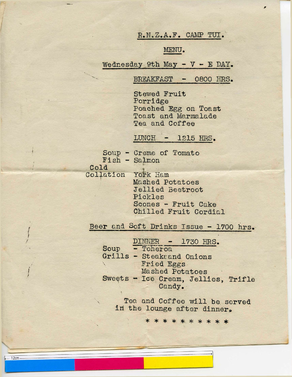 WWII RNZAF Flight Riggers V-E Day Menu