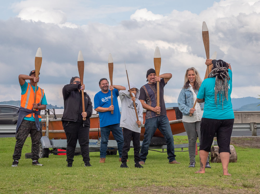 Date19 May 2021Reference NumberPhoto 21-771DescriptionA group of people learning the routine to paddle waka. Reon Tuanau is 3rd from left.FormatDigitalPhotographer/CreatorPettigrew, Nathan