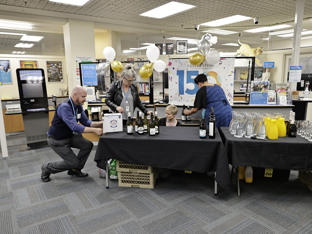 L-R: Harley Couper, Kirsten Allan, Hanna Peters & Shannon Pawhau setting up the bar area (10 April 2021). Pae Korokī, accessed 26/03/2026, https://paekoroki.tauranga.govt.nz/nodes/view/48881