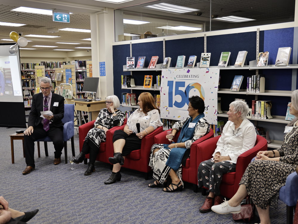 MC Ewan McLeod addressing The Panel L-R: Diane Taggart, Amanda McFadden, Tangimeriana Rua, Sue Pharo & Peggy McConnell
