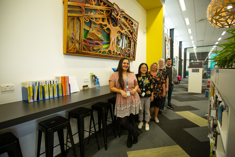 Date9 March 2021Reference NumberPhoto 21-802DescriptionTaken during 2021 by photographer Penelope Coleman, for the library's celebration of 150 years of libraries in Tauranga. Canon EOS 5D Mark III Hone Te Ihi o Te Rangi Ngata Jnr ( Ngāti Porou, Ngāti Ranginui, Ngāi Te Rangi, Te Arawa) was the main artist for the artwork depicted. Aroha Mitchell (Te Arawa, Ngti Porou), created the mahi raranga on the lefthand side.FormatDigitalPhotographer/CreatorPenelope Coleman