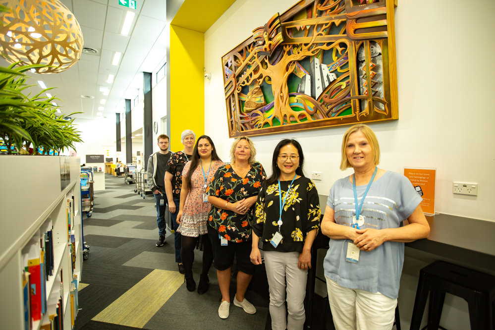 Date9 March 2021Reference NumberPhoto 21-803DescriptionTaken during 2021 by photographer Penelope Coleman, for the library's celebration of 150 years of libraries in Tauranga. Canon EOS 5D Mark III Hone Te Ihi o Te Rangi Ngata Jnr ( Ngāti Porou, Ngāti Ranginui, Ngāi Te Rangi, Te Arawa) was the main artist for the artwork depicted. Aroha Mitchell (Te Arawa, Ngti Porou), created the mahi raranga on the lefthand side.FormatDigitalPhotographer/CreatorPenelope Coleman