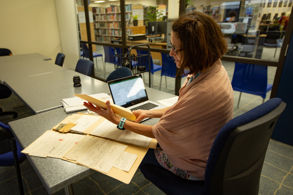 Reference NumberPhoto 21-1099DescriptionGetting to know the collection. Please note, this photograph was staged and we would not normally have folders hanging over the edge of the desk. Taken during 2021 by photographer Penelope Coleman, for the library's celebration of 150 years of libraries in Tauranga, at 2:34 PM (Canon EOS 5D Mark III). FormatDigitalPhotographer/CreatorPenelope Coleman