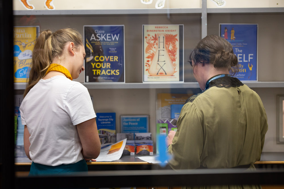 Reference NumberPhoto 21-1152DescriptionTaken during 2021 by photographer Penelope Coleman, for the library's celebration of 150 years of libraries in Tauranga, when archivist Abby Wharne gave a talk. 1:21 PM (Canon EOS 6D). FormatDigitalPhotographer/CreatorPenelope Coleman