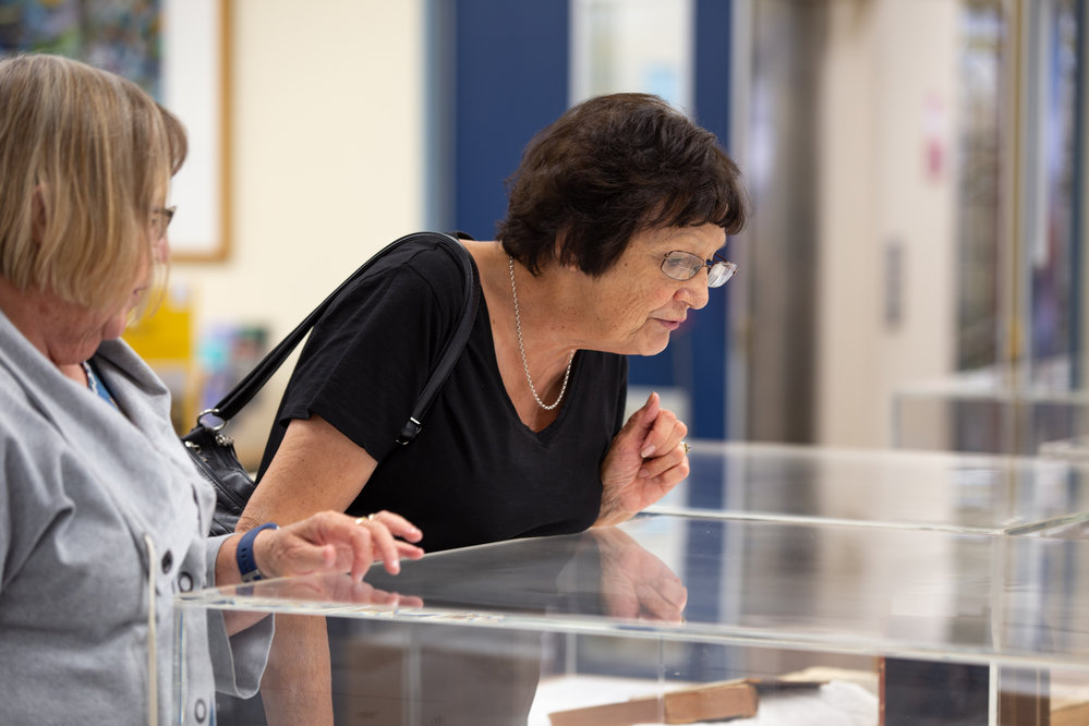 Reference NumberPhoto 21-1166DescriptionTaken during 2021 by photographer Penelope Coleman, for the library's celebration of 150 years of libraries in Tauranga, when archivist Abby Wharne gave a talk. 2:03 PM (Canon EOS 6D). This images shows Raewyn Armitage (right), whose late husband was William Walmsley’s great grandson, and Cheryl Bourke (left), who is his great-great granddaughter. William Walmsley was Tauranga Mechanics' Institute's first librarian.FormatDigitalPhotographer/CreatorPenelope Coleman