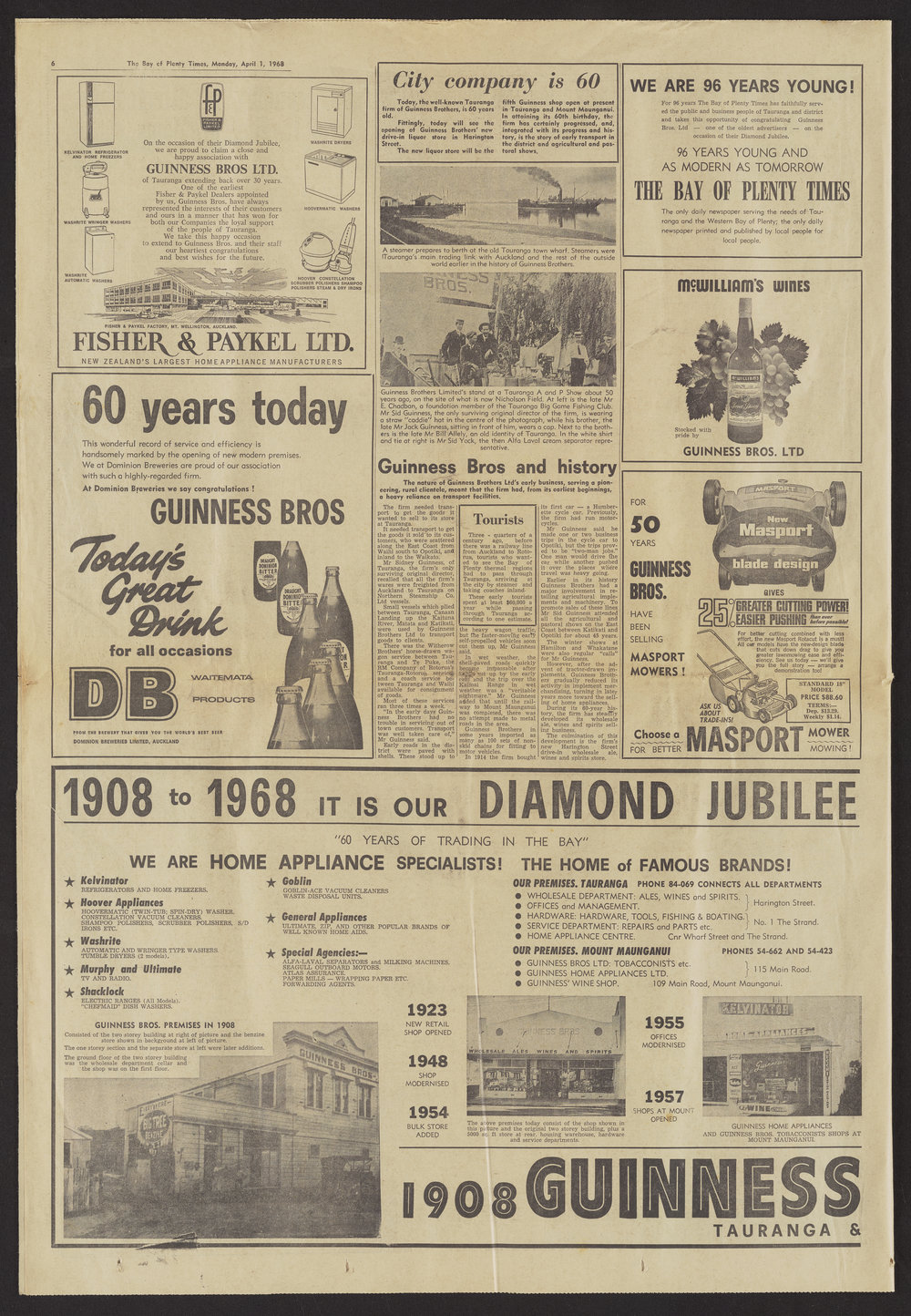 Bay of Plenty Times, 1 April 1968, with account of Guinness Brothers Limited history