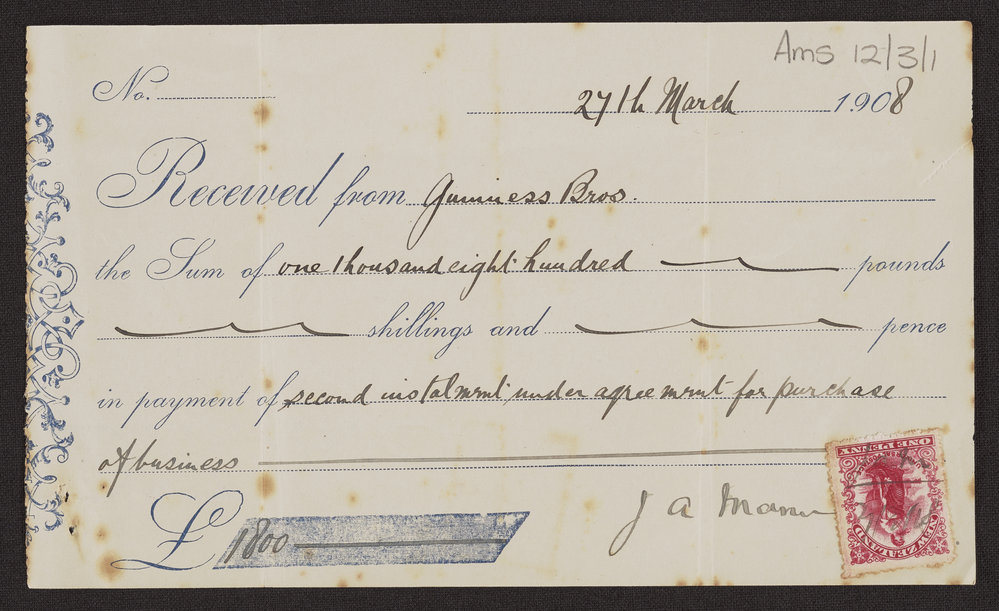 Guinness Brothers Limited, Receipt for purchase of warehouse (27 March 1908). Pae Korokī, accessed 24/03/2026, https://paekoroki.tauranga.govt.nz/nodes/view/50063