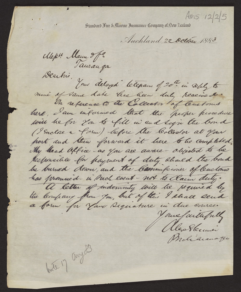 Guinness Brothers Limited, Letter from Standard Fire & Marine (22 October 1883). Pae Korokī, accessed 24/03/2026, https://paekoroki.tauranga.govt.nz/nodes/view/50069