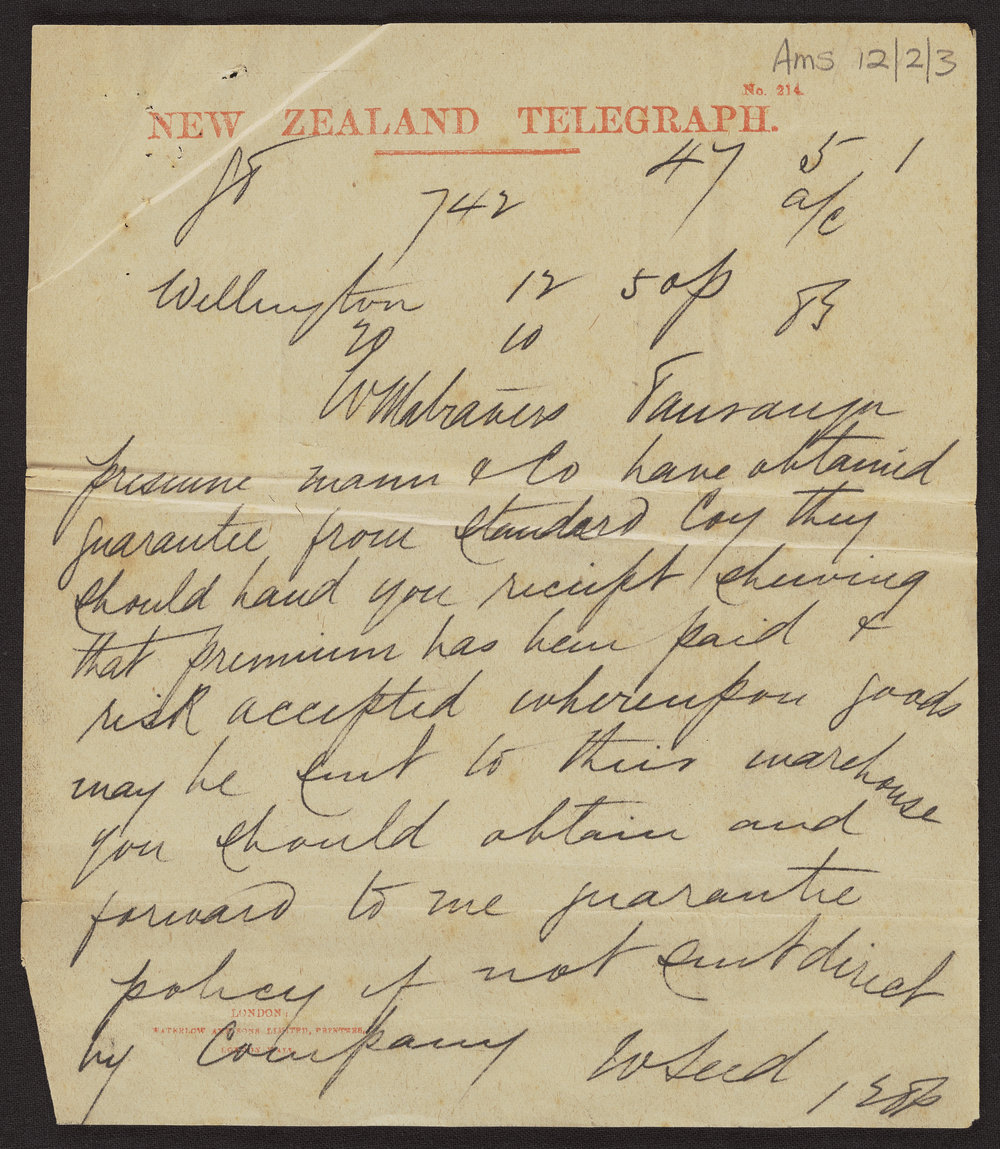 Guinness Brothers Limited, Telegram sent to Officer in Charge of Customs (20 October 1883). Pae Korokī, accessed 24/03/2026, https://paekoroki.tauranga.govt.nz/nodes/view/50071