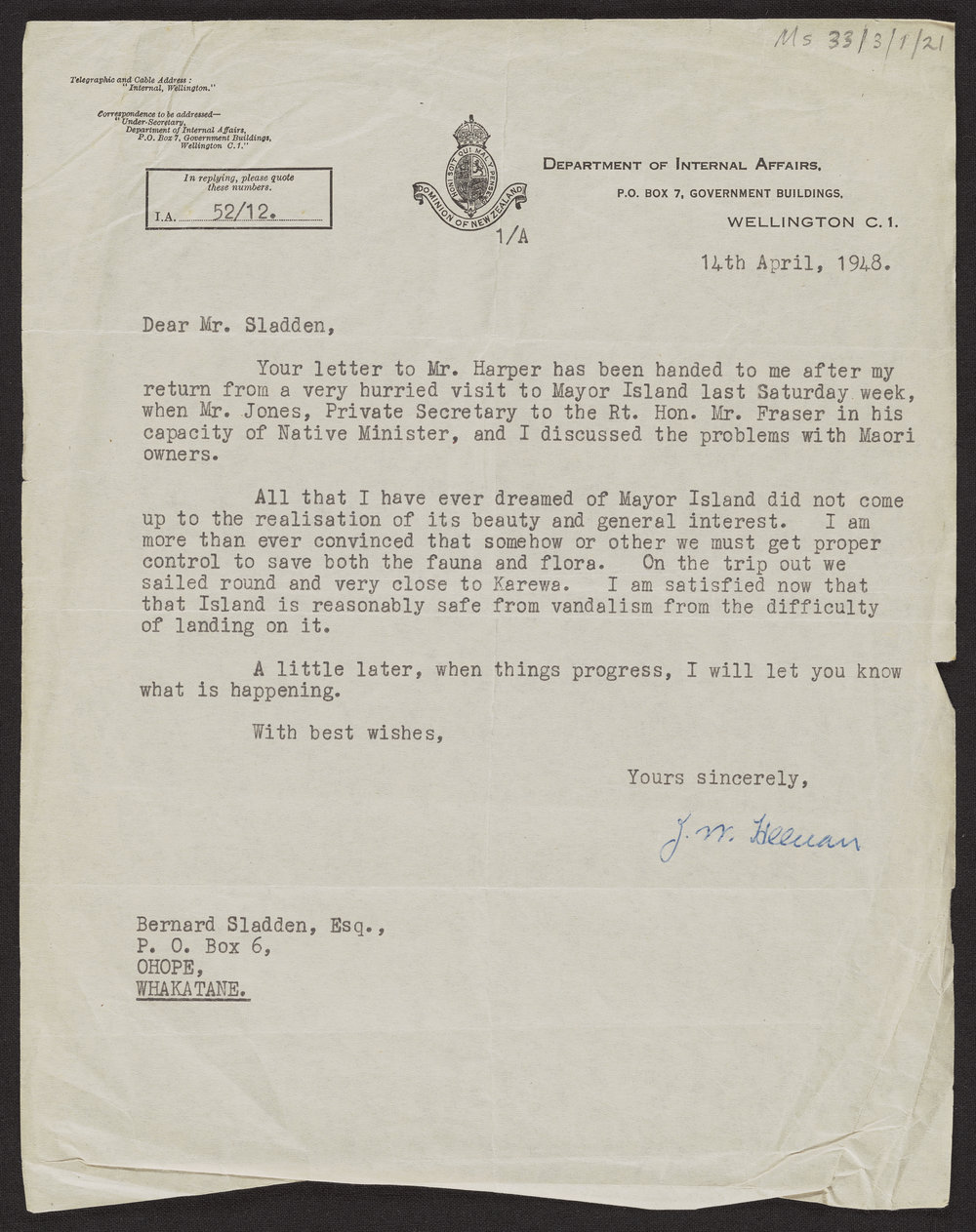 Heenan, Joseph William Allan, 1888-1951, Letter from Joseph William Allan Heenan, under secretary of Department of Internal Affairs, to Bernard Sladden, 14 Apr 1948 (14 Apr 1948). Pae Korokī, accessed 25/03/2026, https://paekoroki.tauranga.govt.nz/nodes/view/50127