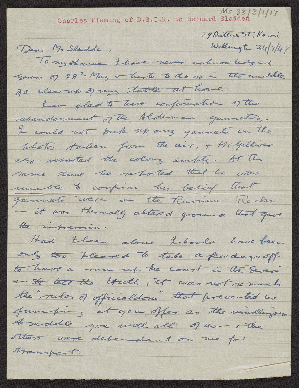 Fleming, Charles Alexander, 1916-1987, Letter from Charles Alexander Fleming to Bernard Sladden, 24 July 1947 (24 July 1947). Pae Korokī, accessed 25/03/2026, https://paekoroki.tauranga.govt.nz/nodes/view/50131
