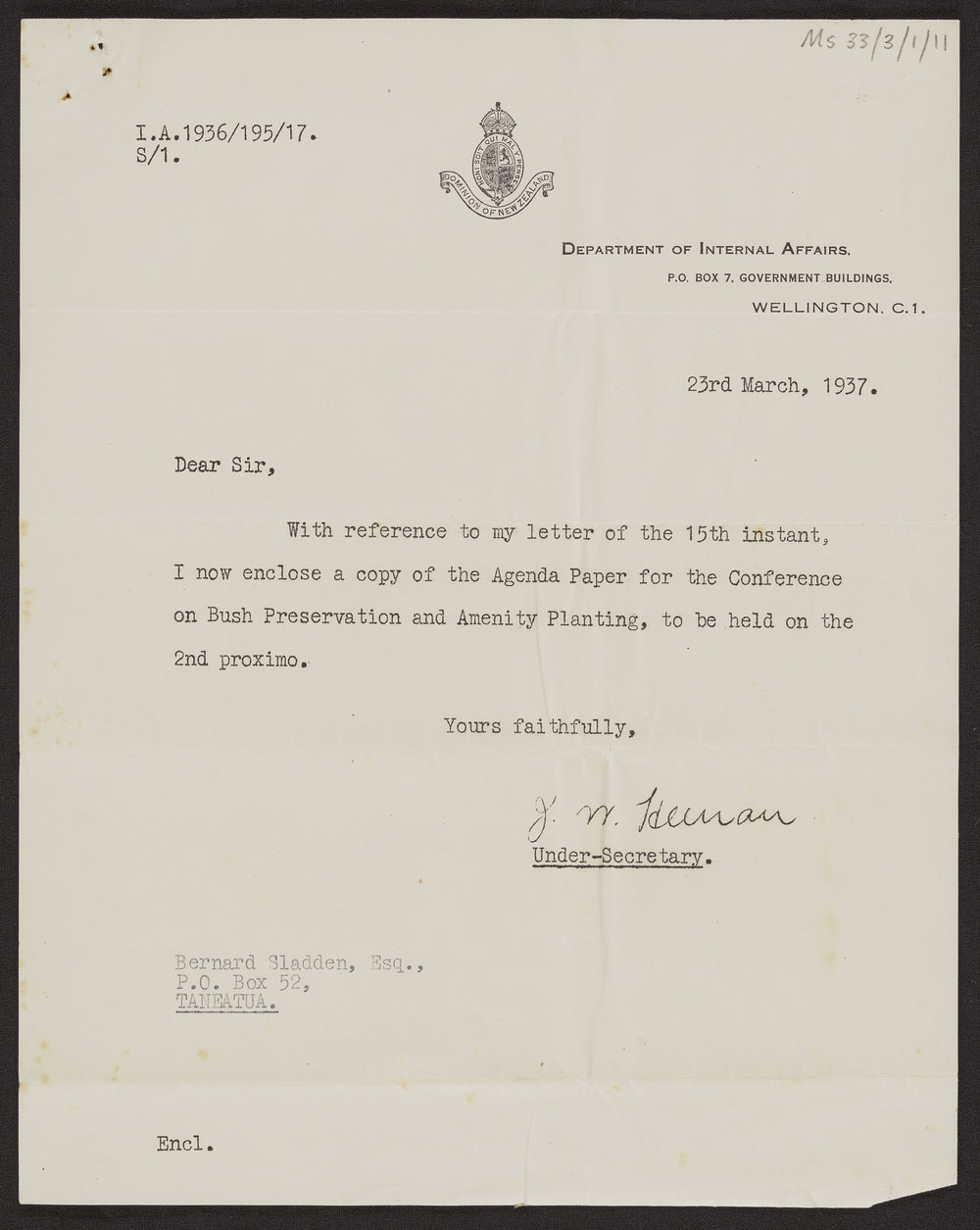 Heenan, Joseph William Allan, 1888-1951, Letter and warrant from Joseph William Allan Heenan, under secretary of Department of Internal Affairs, to Bernard Sladden, 23 Mar 1937 (23 Mar 1937). Pae Korokī, accessed 25/03/2026, https://paekoroki.tauranga.govt.nz/nodes/view/50137