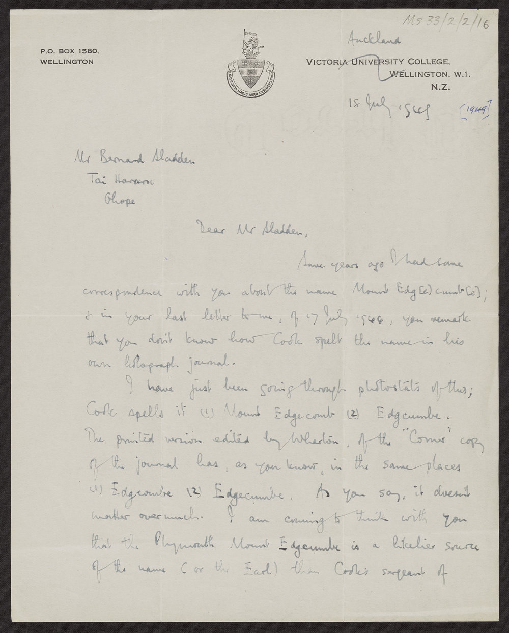 Beaglehole, John Cawte, 1901-1971, Letter from John Cawte Beaglehole, academic at Victoria University College in Wellington, to Bernard Sladden, 18 Jul 1949 (18 Jul 1949). Pae Korokī, accessed 25/03/2026, https://paekoroki.tauranga.govt.nz/nodes/view/50156