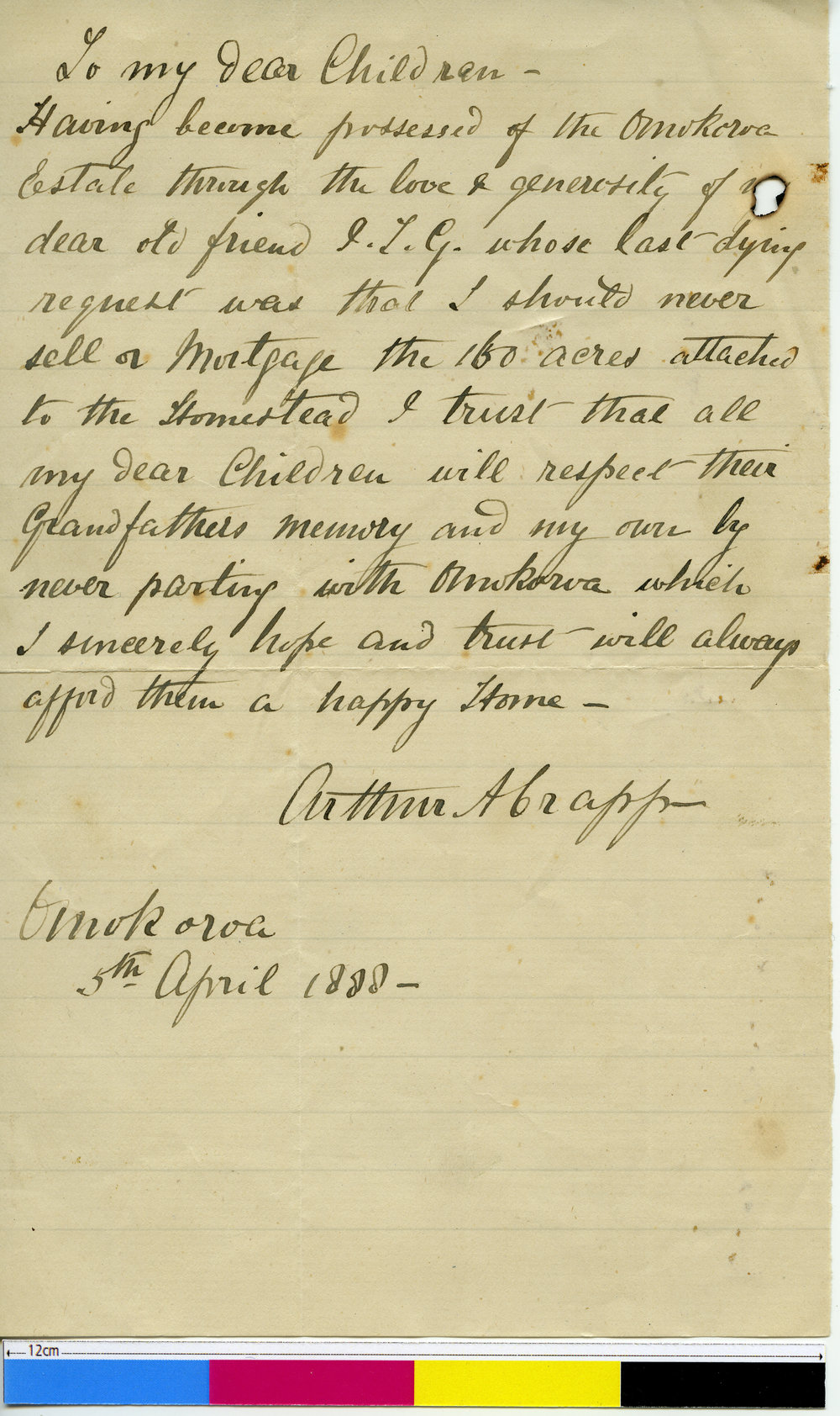 Crapp, Arthur Algernon, 1843-1928, Letter from Arthur Algernon Crapp to his children (5 Apr 1888). Pae Korokī, accessed 05/04/2026, https://paekoroki.tauranga.govt.nz/nodes/view/5018