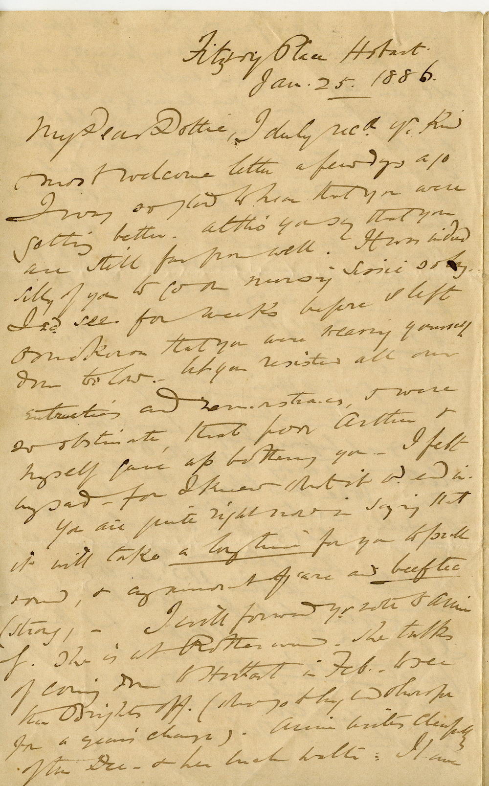 Gellibrand, Joseph Tice, 1826-1887, Letter from Joseph Tice Gellibrand, writing from Fitzroy Place in Hobart, to Elizabeth Crapp (25 Jan 1886). Pae Korokī, accessed 05/04/2026, https://paekoroki.tauranga.govt.nz/nodes/view/5026