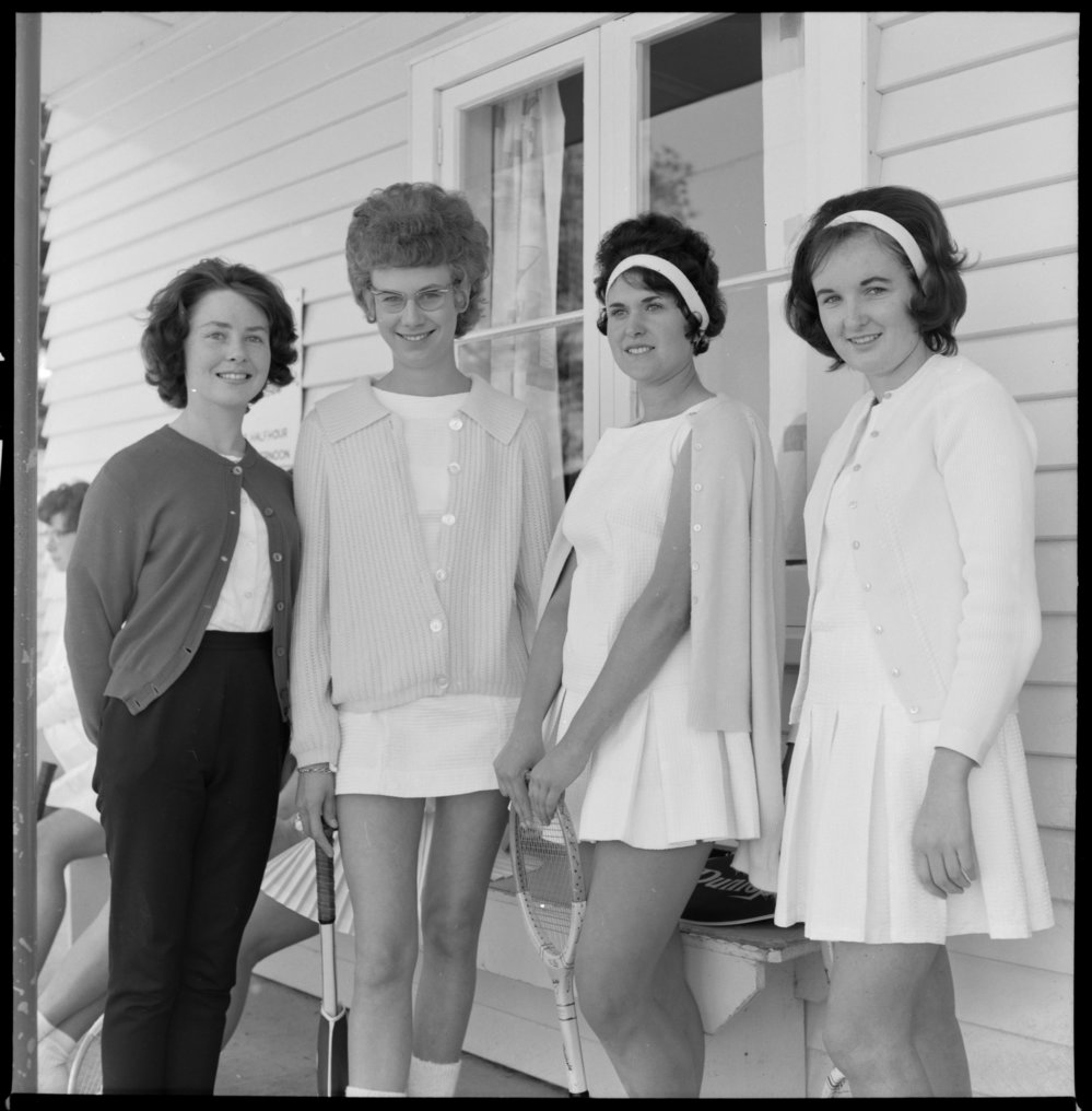 Tennis opening of the season. Lois Evans, Wynn Opie, Rosemary Morris, Carolyn Reilly (12 October 1964). Pae Korokī, accessed 05/04/2026, https://paekoroki.tauranga.govt.nz/nodes/view/53720