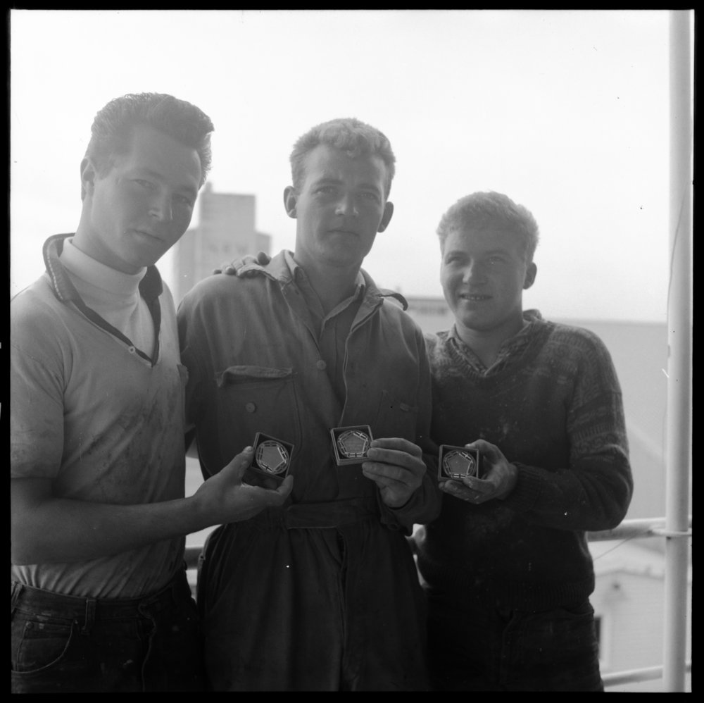 Norbega crew with medals. H. Guttorormsen, J. Bolstad, W. Karlsen