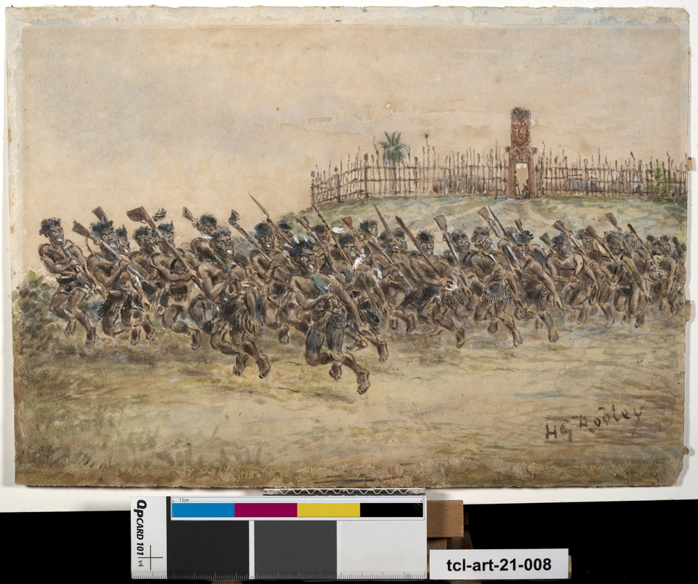 Robley, Horatio Gordon, 1840-1930, Haka peruperu by Te Arawa at Maketū (1865). Pae Korokī, accessed 24/04/2026, https://paekoroki.tauranga.govt.nz/nodes/view/56934