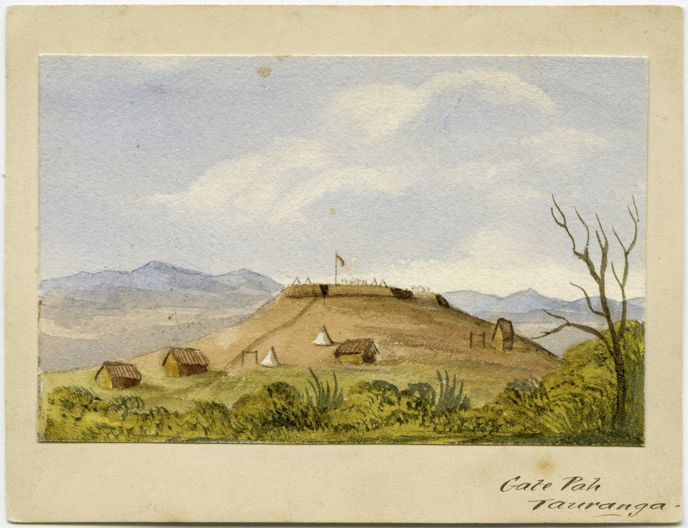 Date1864Reference NumberArt 21-022DescriptionOriginal handwriting on front "Gate Pah Tauranga". Painted by an unknown soldier from the 43rd regiment who fought at the battle of Pukehinahina.FormatWatercolourPhysical Description121mm x 93mm