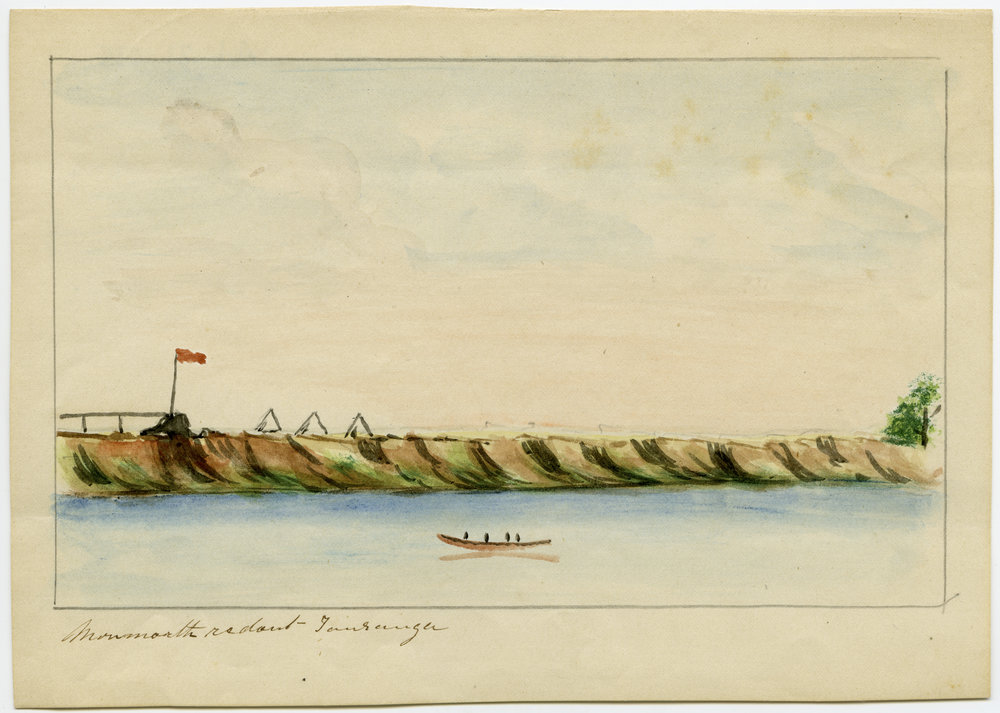 Reference NumberArt 21-035DescriptionOriginal handwriting on front "Monmouth redoubt Tauranga." A waka (canoe) is seen on the water. Painted by an unknown soldier who was present at the siege of Maketū, the battles of Pukehinahina and Te Ranga, and during the subsequent occupation of the Tauranga district.FormatWatercolourPhysical Description178mm x 126mm