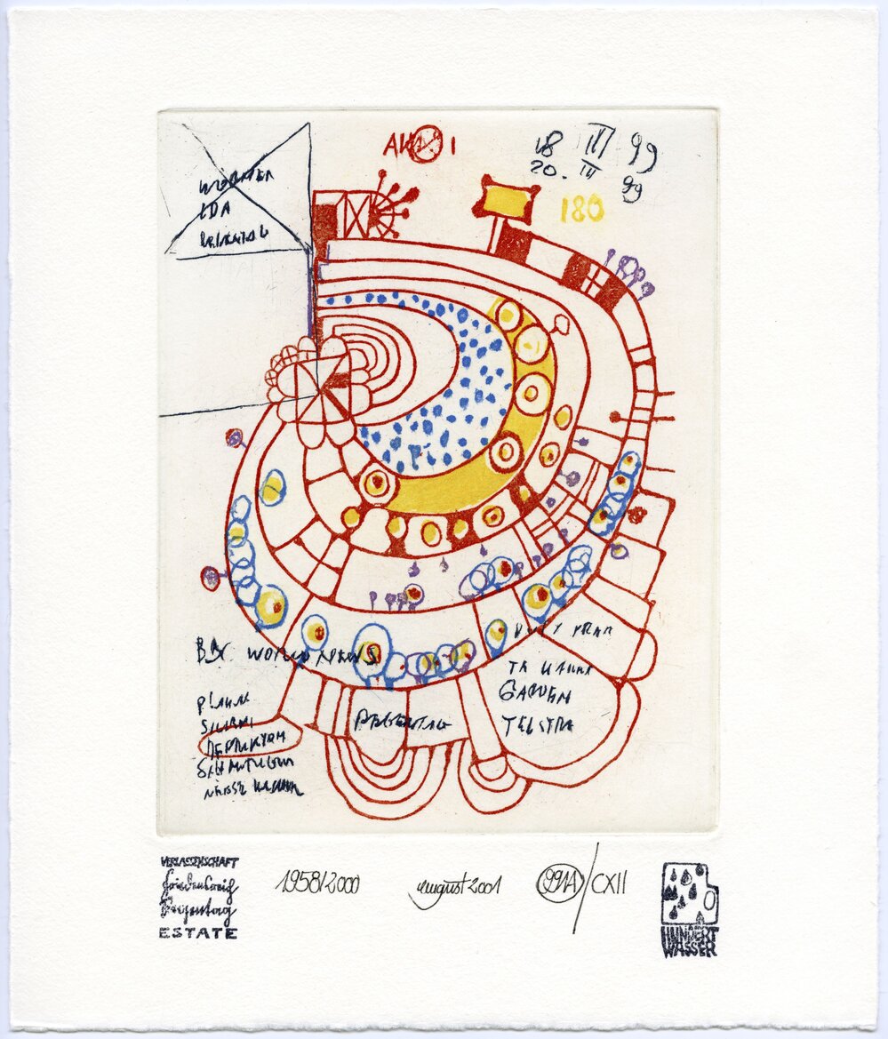 Hundertwasser, Friedensreich, 1928-2000, 991 A /CXII Doodle for catalogue Raisonne (August 2001). Pae Korokī, accessed 04/04/2026, https://paekoroki.tauranga.govt.nz/nodes/view/57031