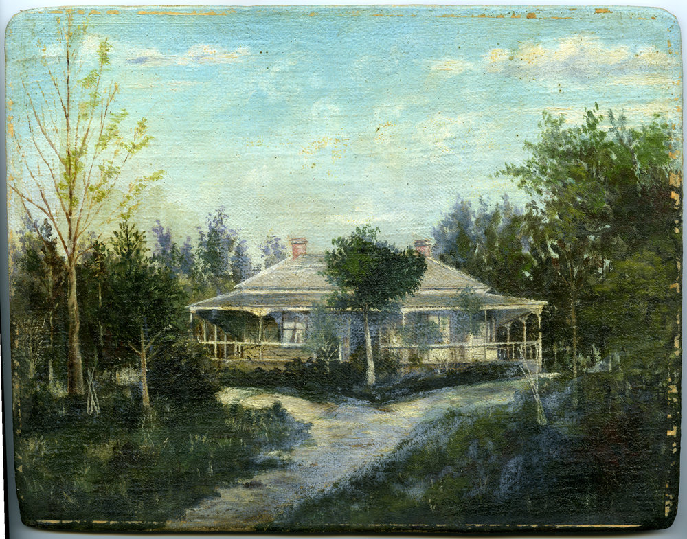 Reference NumberArt 21-116DescriptionOriginal oil painting of colonial house with verandah, canvas stretched on board of old atlas, c 2nd half of 19th century.FormatOil paintingPhysical Description321mm x 251mm