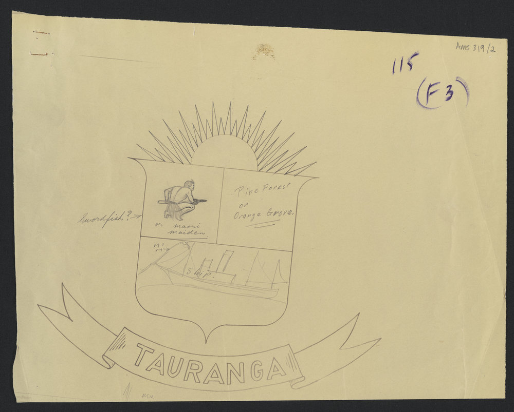 Unknown, Sketch of alternative design for the Tauranga City Council crest (c. 1963). Pae Korokī, accessed 19/03/2026, https://paekoroki.tauranga.govt.nz/nodes/view/57348