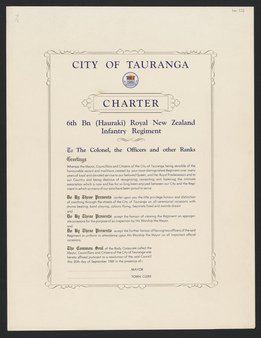 Tauranga City Council, City of Tauranga Charter for the 6th Battalion (Hauraki) Royal New Zealand Infantry Regiment. (September 1969). Pae Korokī, accessed 05/04/2026, https://paekoroki.tauranga.govt.nz/nodes/view/57354