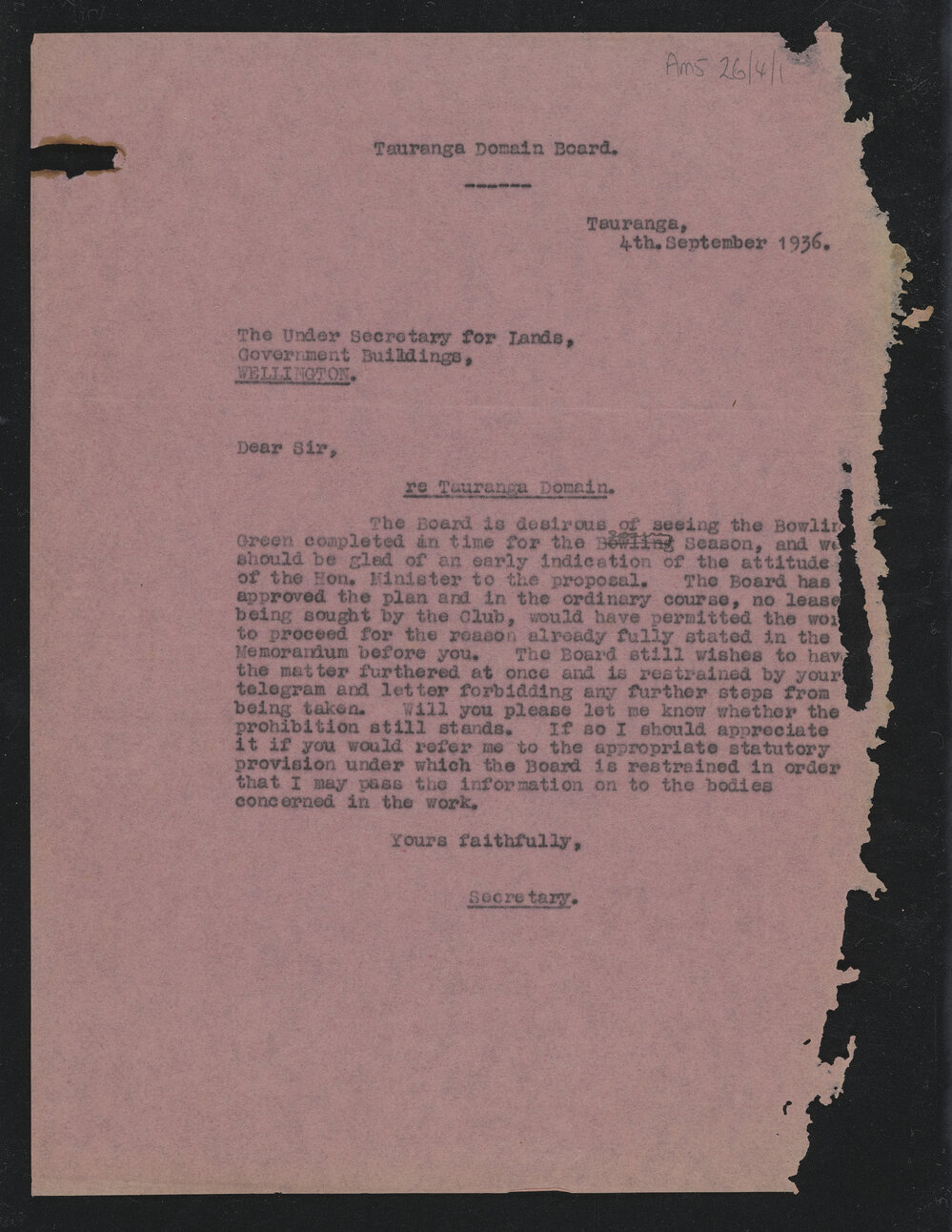 Letter from the Secretary of Tauranga Domain Board to the Under Secretary for Lands, 4 September 1936