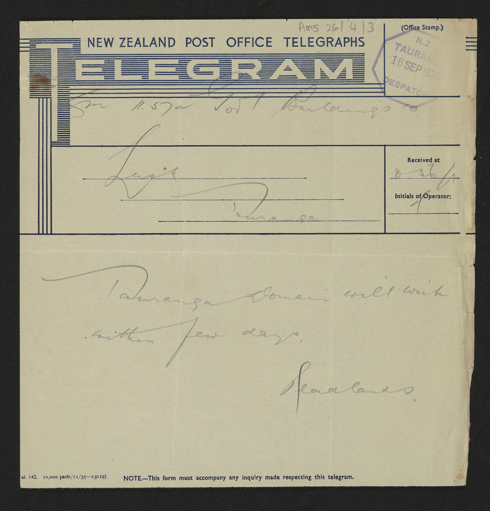 Tauranga Domain Board, Telegram, Mr Lusk, Secretary of Tauranga Domain Board (1936). Pae Korokī, accessed 22/04/2026, https://paekoroki.tauranga.govt.nz/nodes/view/57396