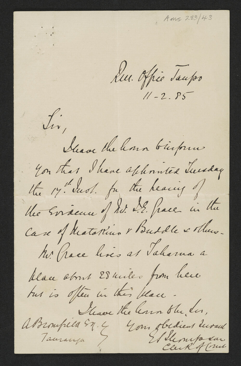 Kempson, E. S., Letter from E. S. Kempson to A. Bromfield (11 Feb 1885). Pae Korokī, accessed 03/04/2026, https://paekoroki.tauranga.govt.nz/nodes/view/57440