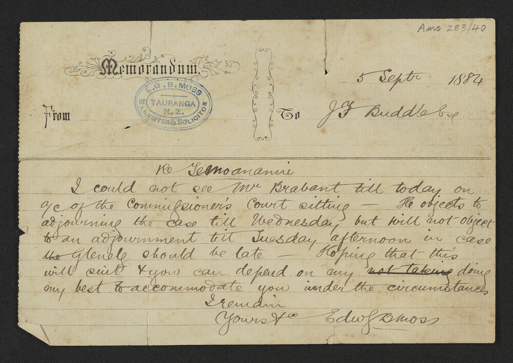 Moss, E. G. B., Memorandum from E. G. B. Moss to Joseph Forster Buddle (5 Sep 1884). Pae Korokī, accessed 03/04/2026, https://paekoroki.tauranga.govt.nz/nodes/view/57443