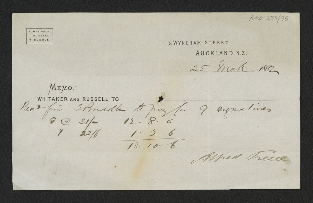 Whitaker, Russell and Buddle, Receipt written on paper headed with "F. Whitaker. T. Russell. T. Buddle". (25 Mar 1882). Pae Korokī, accessed 03/04/2026, https://paekoroki.tauranga.govt.nz/nodes/view/57448
