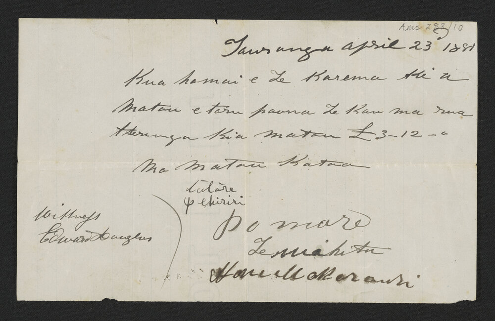 Turner and Buddle, "Receipt of Ngai Te Ahi for £3.16.0" (23 Apr 1881). Pae Korokī, accessed 03/04/2026, https://paekoroki.tauranga.govt.nz/nodes/view/57474