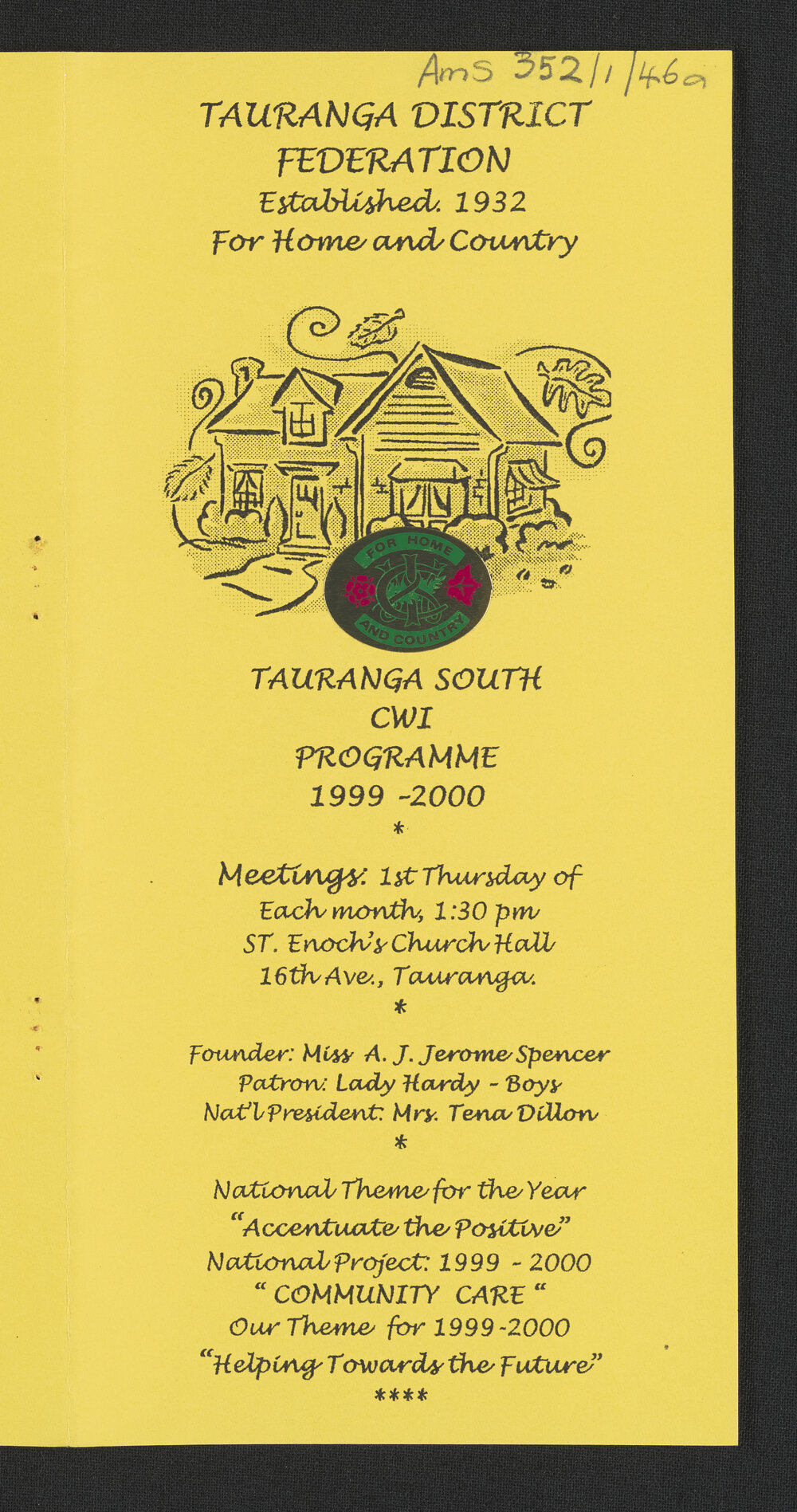 Tauranga South Women's Institute, Tauranga South Women's Institute programme for 1999-2000 (1999-2000). Pae Korokī, accessed 22/04/2026, https://paekoroki.tauranga.govt.nz/nodes/view/57504