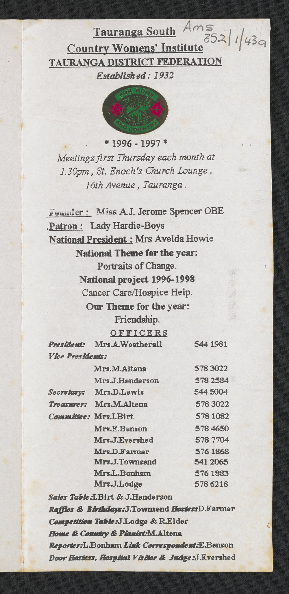 Tauranga South Women's Institute, Tauranga South Women's Institute programme for 1996-1997 (1996-1997). Pae Korokī, accessed 22/04/2026, https://paekoroki.tauranga.govt.nz/nodes/view/57507