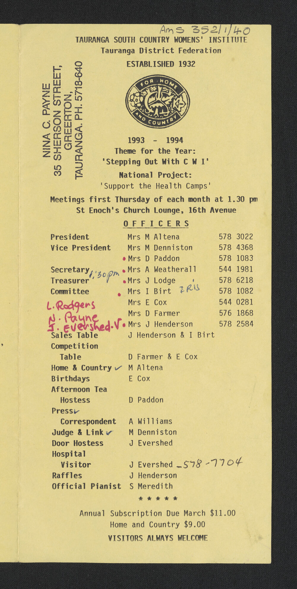 Tauranga South Women's Institute, Tauranga South Women's Institute programme for 1993-1994 (1993-1994). Pae Korokī, accessed 22/04/2026, https://paekoroki.tauranga.govt.nz/nodes/view/57510