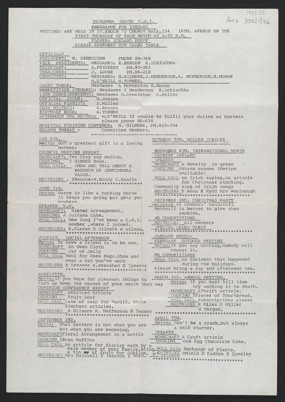 Tauranga South Women's Institute, Tauranga South Women's Institute programme for 1982-1983 (1982-1983). Pae Korokī, accessed 22/04/2026, https://paekoroki.tauranga.govt.nz/nodes/view/57514