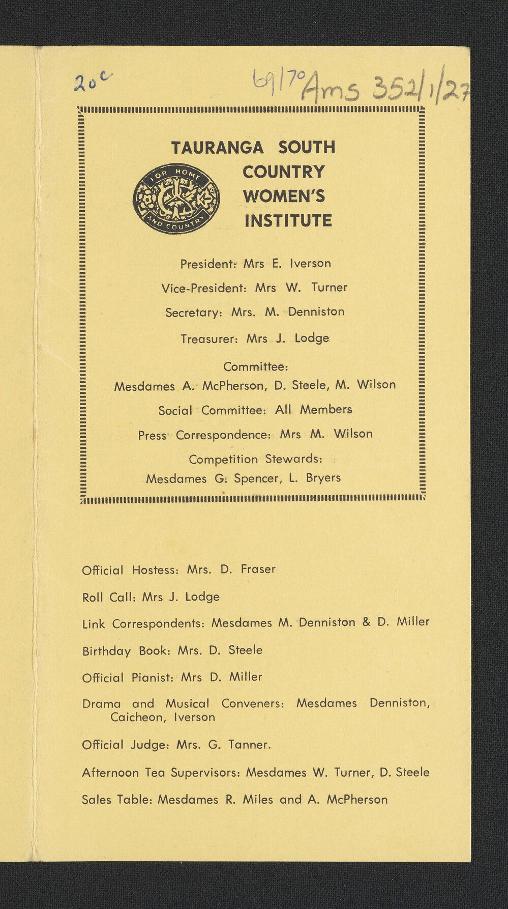 Tauranga South Women's Institute, Tauranga South Women's Institute programme for 1969-1970 (1969-1970). Pae Korokī, accessed 22/04/2026, https://paekoroki.tauranga.govt.nz/nodes/view/57523