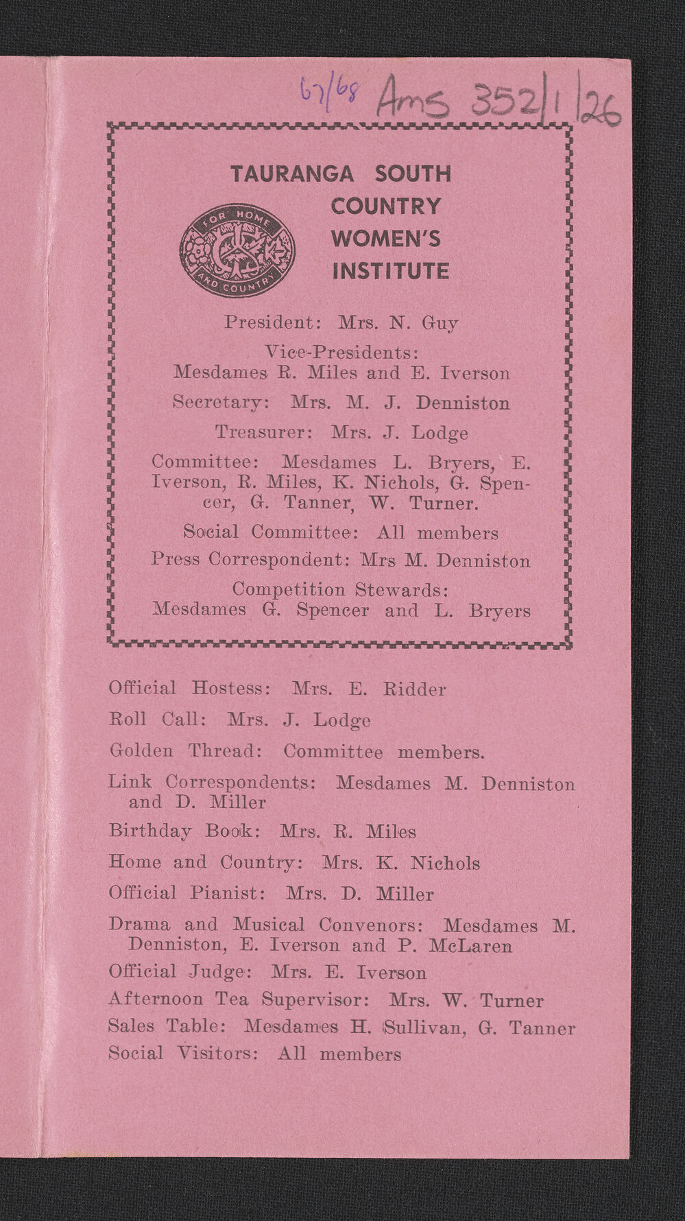 Tauranga South Women's Institute, Tauranga South Women's Institute programme for 1967-1968 (1967-1968). Pae Korokī, accessed 22/04/2026, https://paekoroki.tauranga.govt.nz/nodes/view/57524