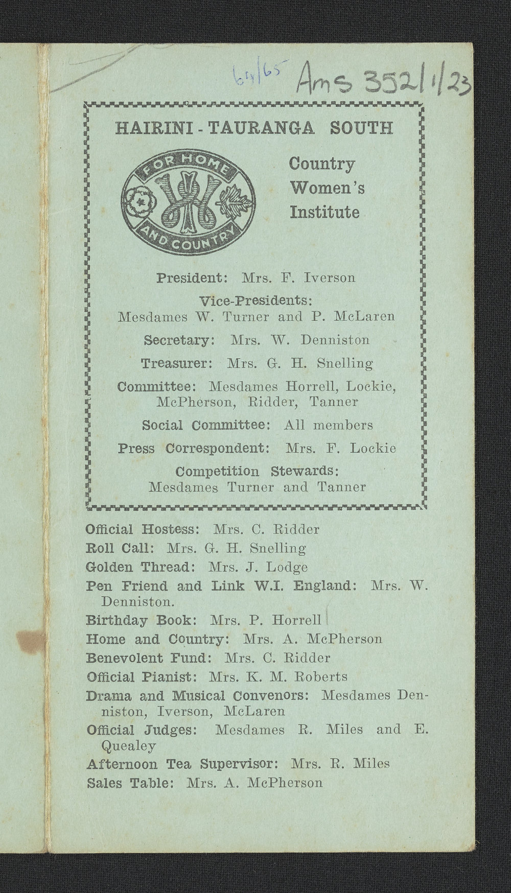 Hairini-Tauranga South Women's Institute, Hairini-Tauranga South Women's Institute programme for 1964-1965 (1964-1965). Pae Korokī, accessed 22/04/2026, https://paekoroki.tauranga.govt.nz/nodes/view/57527