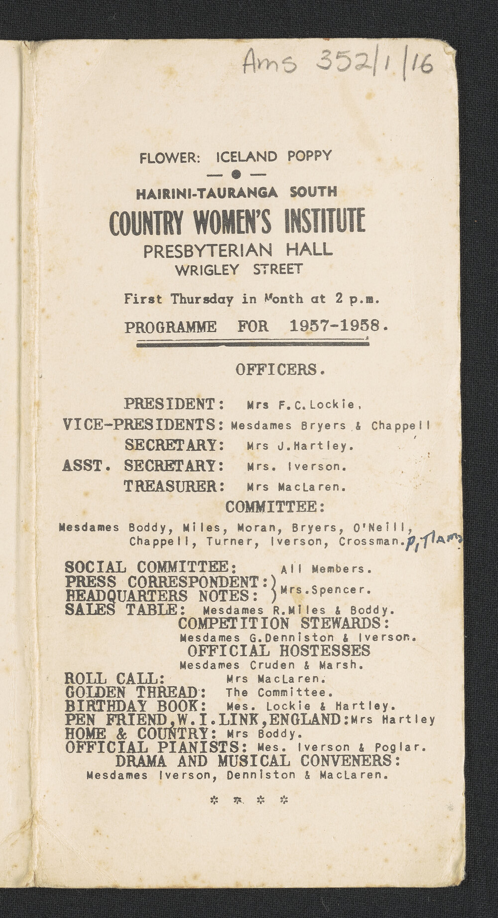 Hairini-Tauranga South Women's Institute, Hairini-Tauranga South Women's Institute programme for 1957-1958 (1957-1958). Pae Korokī, accessed 22/04/2026, https://paekoroki.tauranga.govt.nz/nodes/view/57534