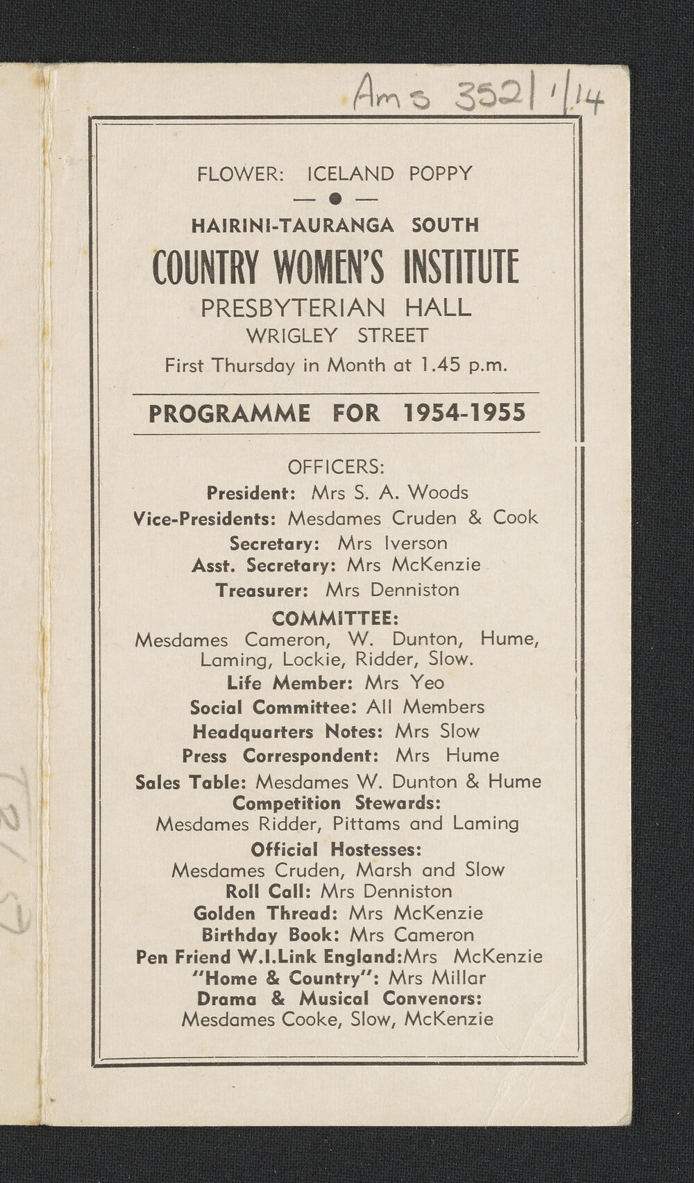 Hairini-Tauranga South Women's Institute, Hairini-Tauranga South Women's Institute programme for 1954-1955 (1954-1955). Pae Korokī, accessed 22/04/2026, https://paekoroki.tauranga.govt.nz/nodes/view/57536