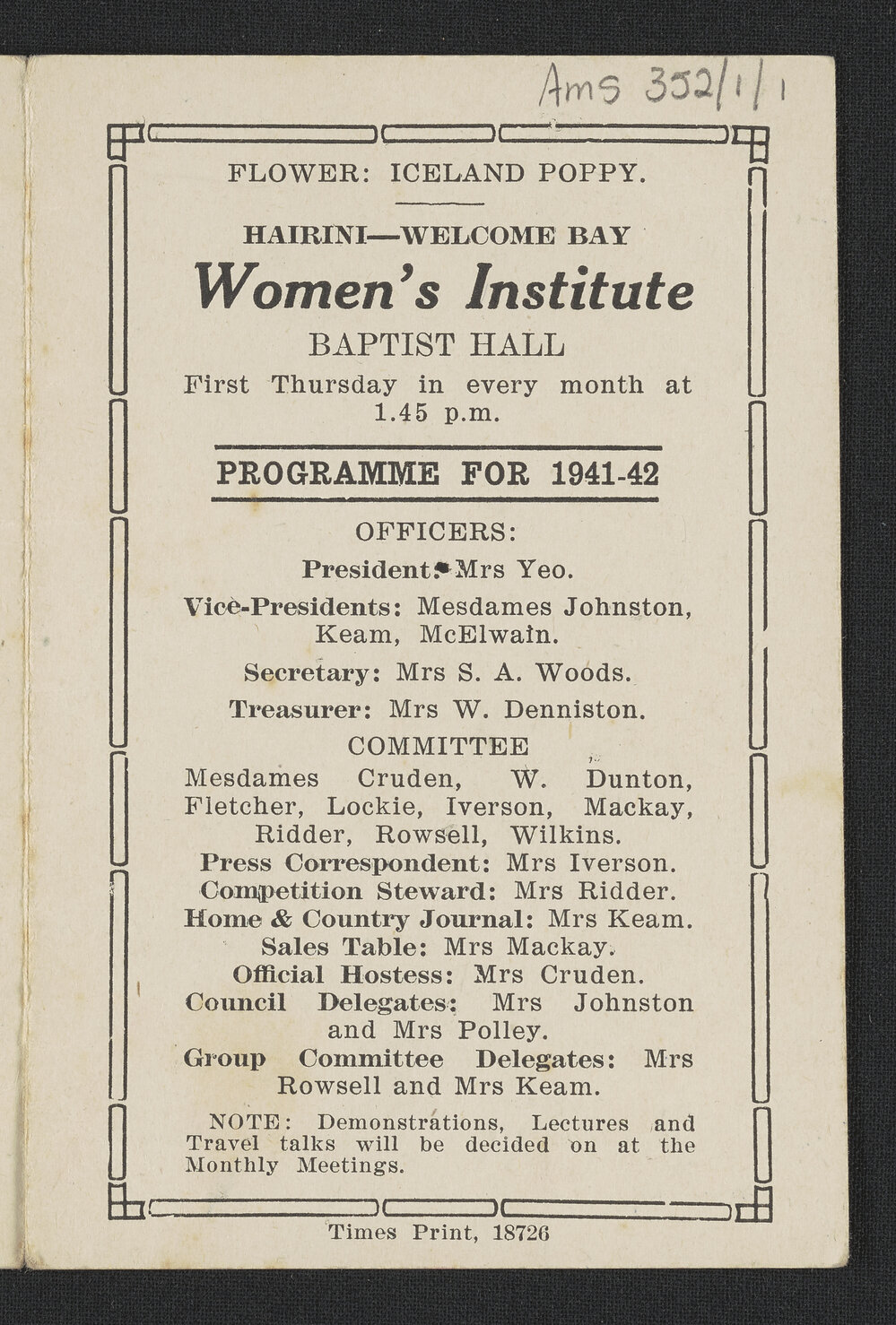 Hairini-Welcome Bay Women's Institute programme for 1941-1942