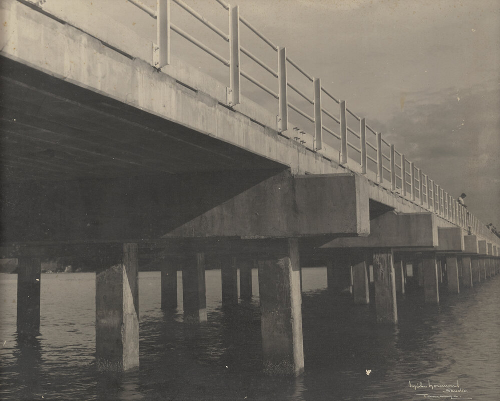 Datec. 1959Reference NumberPhoto 21-1244DescriptionTauranga Harbour bridge completed in 1959. Designed and constructed by Ministry of Works. All prestressed concrete was supplied by Roberts Concrete Products Ltd. FormatPrintPhotographer/CreatorHammond, Mike